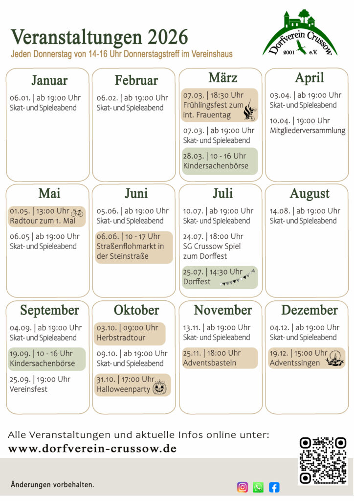Der Dorfverein versucht alte und neue Traditionen im Dorf zu erhalten und zu gestalten. Wir unterstützen die Senioren und fördern die Jugend. Hierbei steht bei uns im Vordergrund, die Gemeinschaft und das gemeinsame Leben im Dorf zu stärken. Aber auch der regionalen Kultur und Historie räumen wir eine hohe Priorität ein. Einige unserer Veranstaltungen organisieren und planen wir daher mit anderen Crussower Vereinen und regionalen Anbietern.